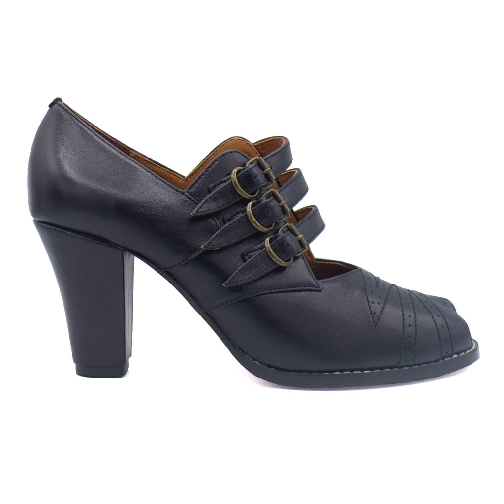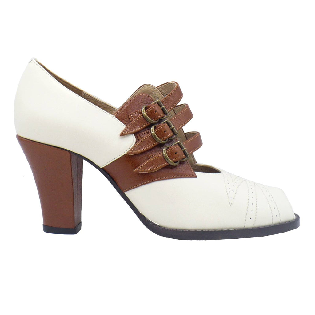 A peep-toe version of the Amelia, Aviator is an early 1930’s reproduction sturdy leather soles and zig zag stitching on the vamp. Adjustable roller buckles on triple arch straps help this style stay snugly on your feet.